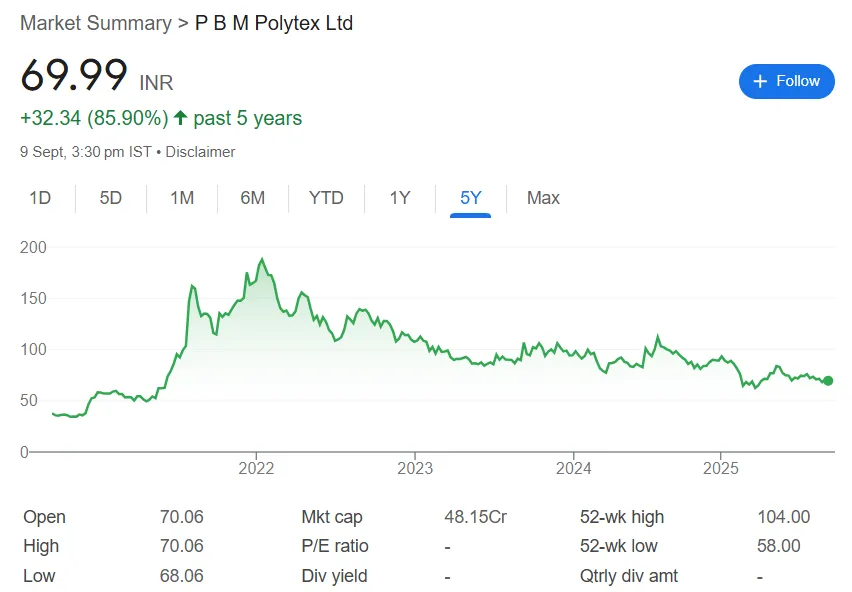 Explore more about PBM Polytex share history and updates on https://finance.yahoo.com/quote/PBMPOLY.BO/
